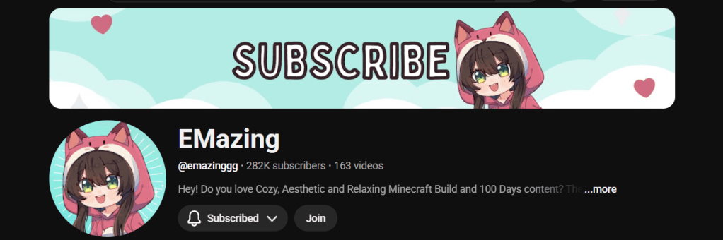 Emazing creates cozy Minecraft content. Her videos usually focus on grand builds or 100-day challenges, making them perfect for when you want to immerse yourself in something without any rush.