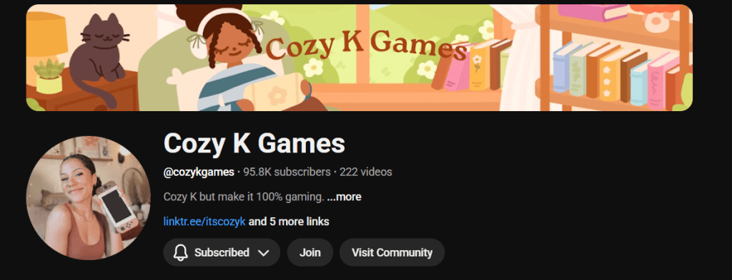 Cozy K Games focuses on cozy indie games and slower-paced gameplay, often highlighting titles that feel comforting and low-stress. Her content is very soft and always feels aligned with the cozy gaming aesthetic.
